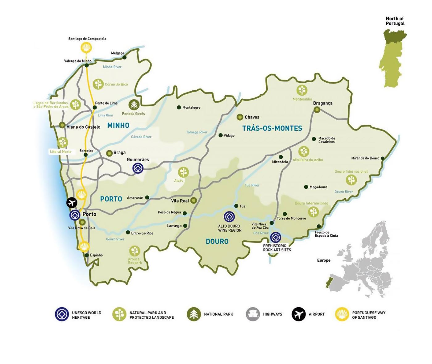 Map of northern Portugal. Northern Portugal map (Southern Europe - Europe) to print. Northern Portugal map (Southern Europe - Europe) to download. The green and pleasant north of Portugal is a place of traditional merry-making where annual festivals are ablaze with colourful costumes, lively processions and frenetic folk-dancing followed by a feast of fireworks. Northern Portugal is the country most fertile region both in culture and agriculture, set between the Spanish province of Galicia to the north and the Douro Valley to the south as its shown in northern Portugal map. Occupying the country north western corner, the lush green Minho region takes its name from the river that has always marked Portugal’s northern frontier, with its careless, capricious course guarded by fortified towns and citadels en route to the Atlantic. Braga, its capital, is an ancient Celtic city with more than 300 churches. Outside the city, the Baroque splendour of Bom Jesus do Monte is an important pilgrimage shrine.